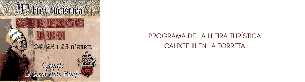 La Torreta de Canals tornarà a viure la Fira Turística ‘Calixte III’ que se celebrarà els dies 24, 25 i 26 d’abril. Aquesta fira està impulsada per la regidoria de Turisme de l’Ajuntament de Canals amb la col·laboració de la Diputació de València.