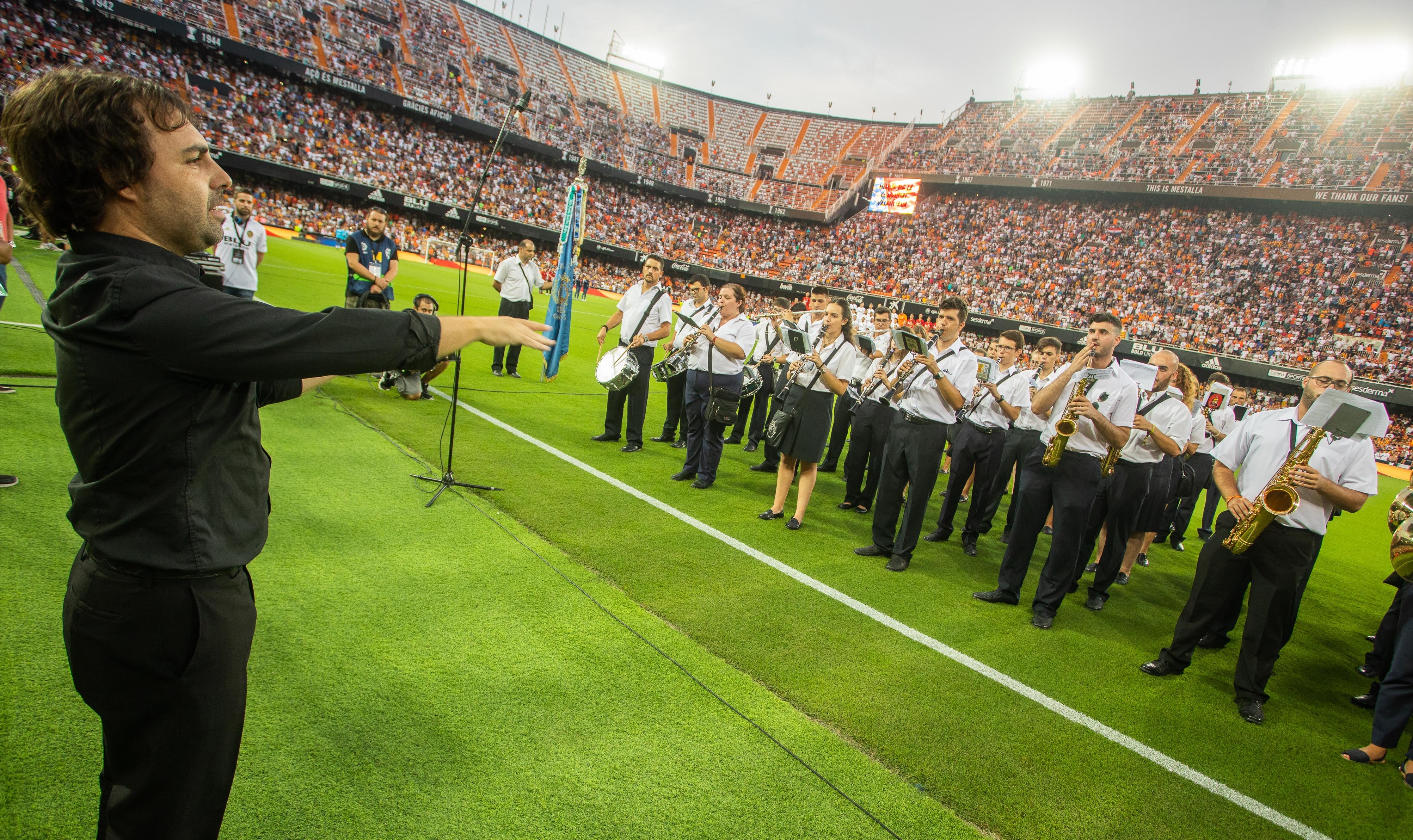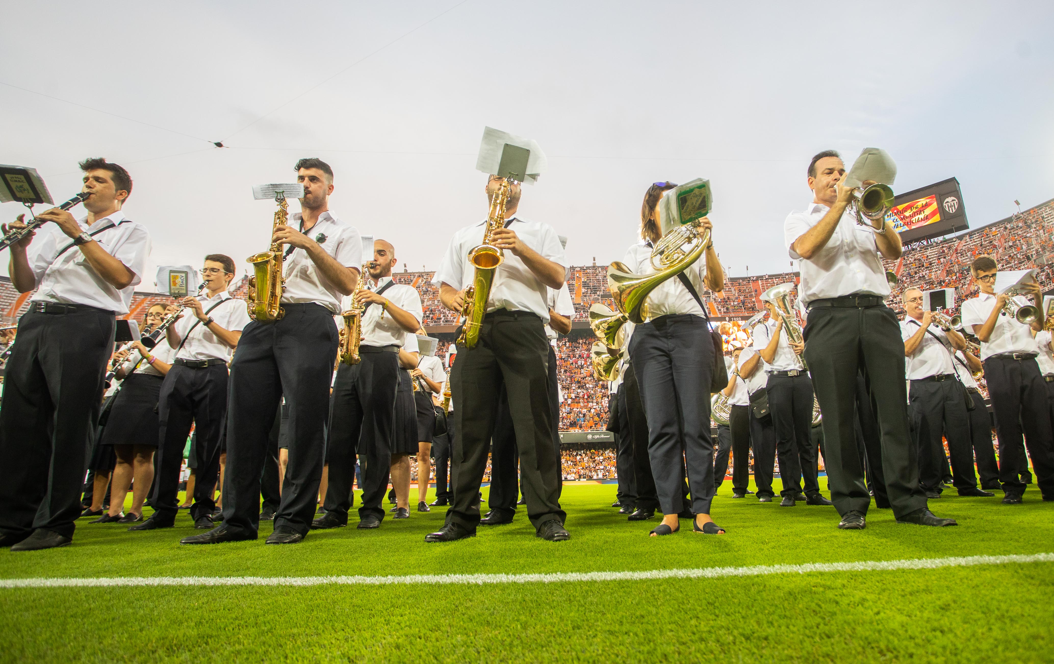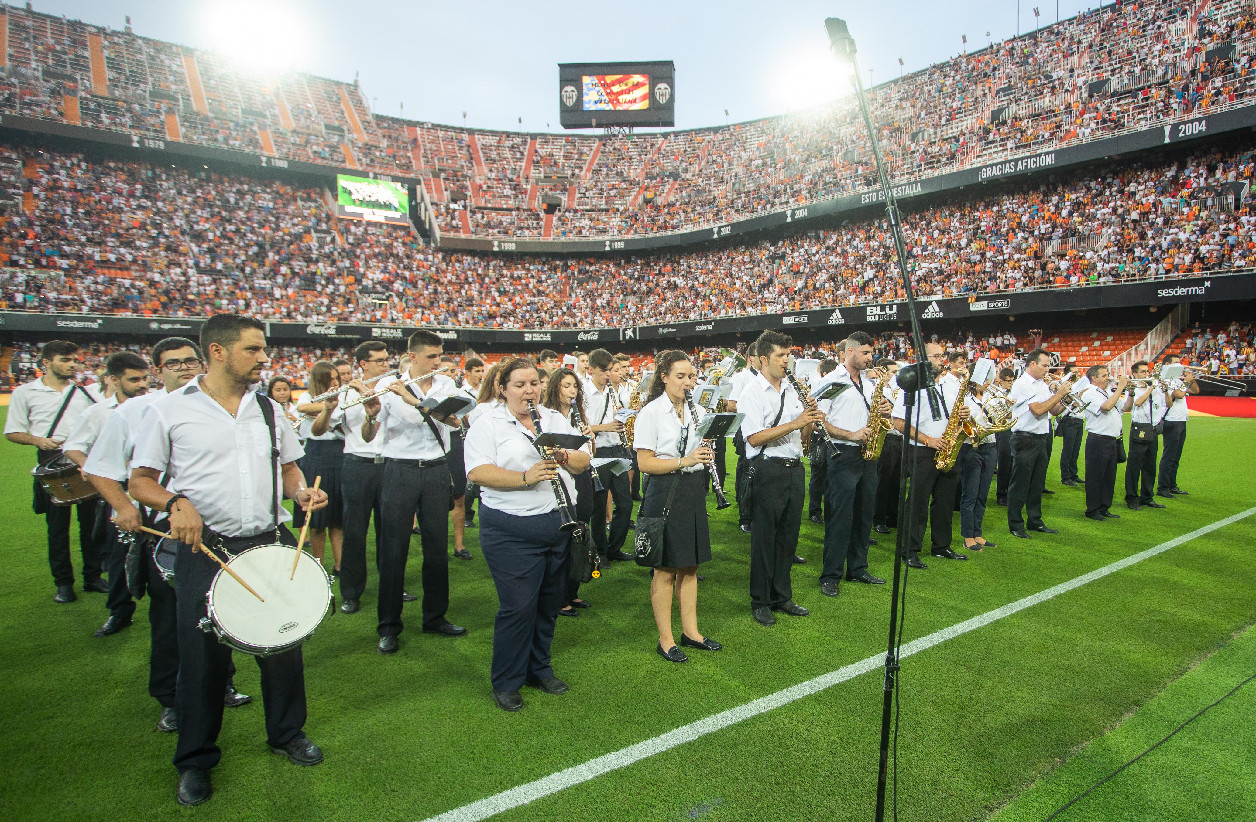 La banda de Canals va rebre la invitació del club per interpretar diferents obres musicals durant la presentació del València C.F i durant el descans del partit front al Bayer Leverkusen alemany el passat dissabte dia 11 d’agost.