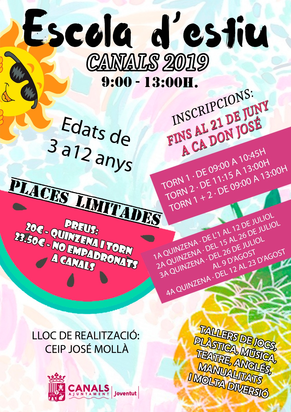 Les inscripcions ja es poden realitzar a la Casa de la Cultura "Ca Don José" fins al 21 de juny i les places estaran limitades a 100 xiquets per torn. El preu serà 20€ per als empadronats a Canals i 23,50€ per als no empadronats.