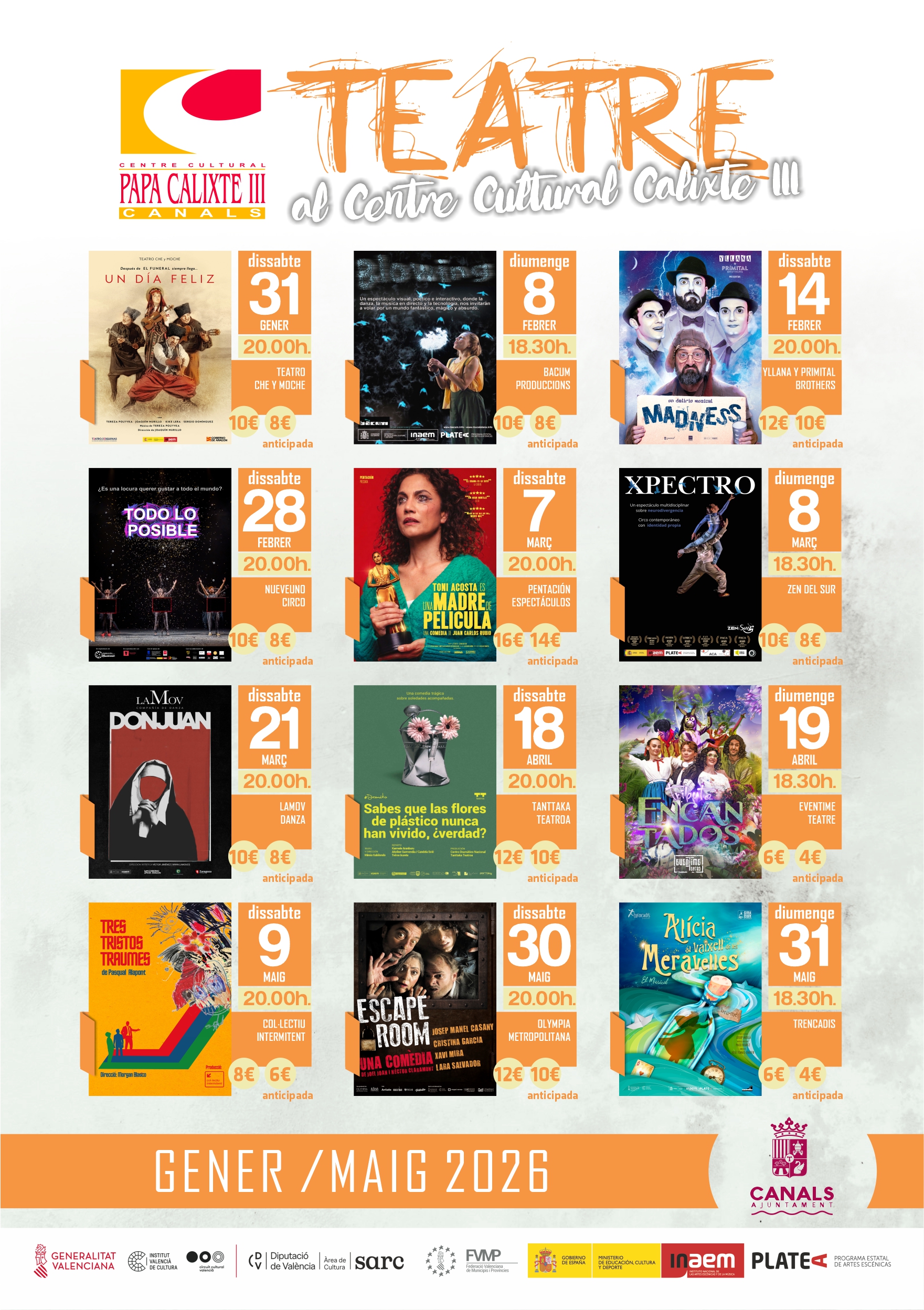 La regidoria de Cultura de l’Ajuntament de Canals ha anunciat la nova programació teatral que tindrà lloc de gener a maig de 2026.