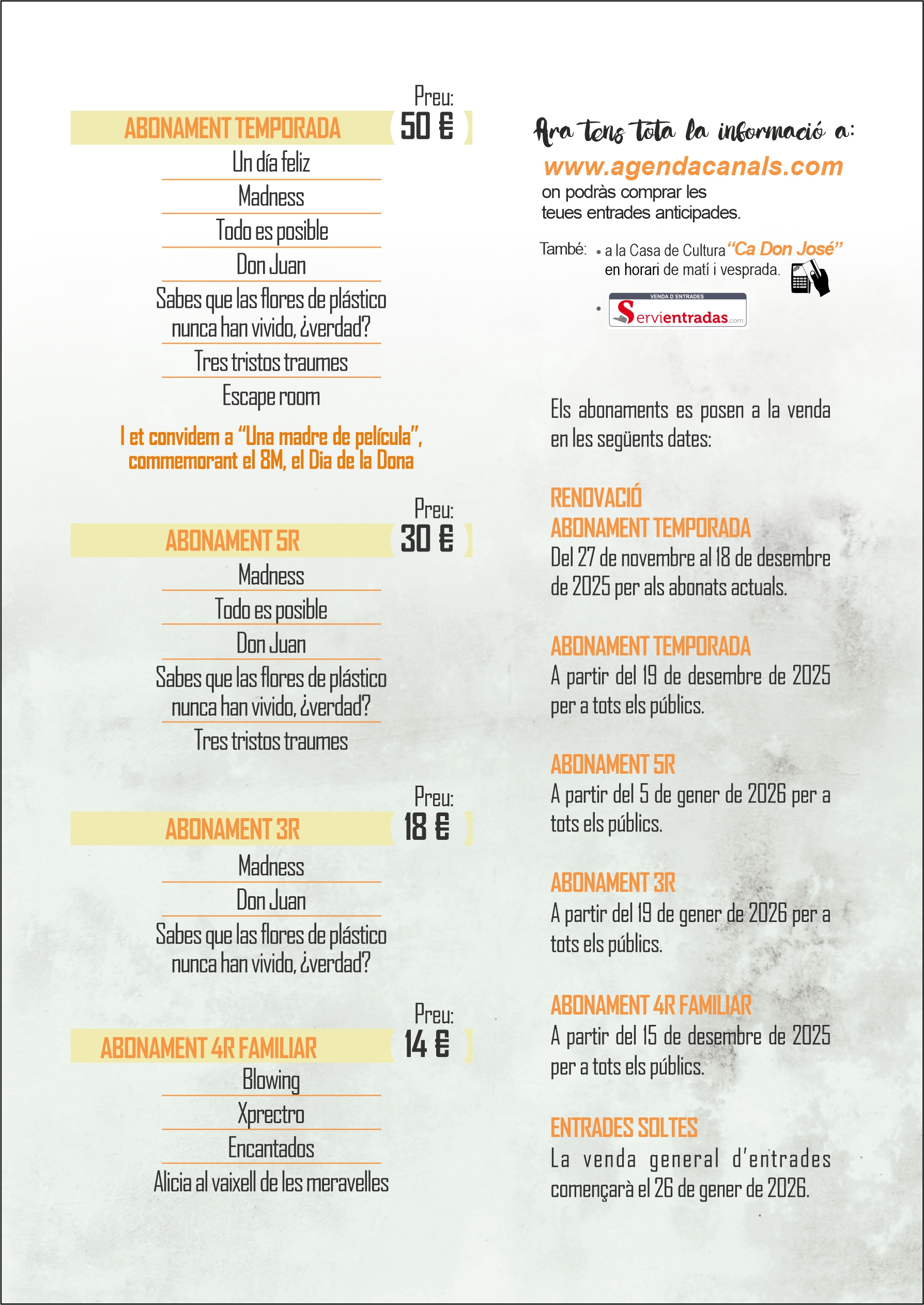 Podeu consultar la programació i els abonaments en els cartells o en la pàgina web www.agendacanals.com