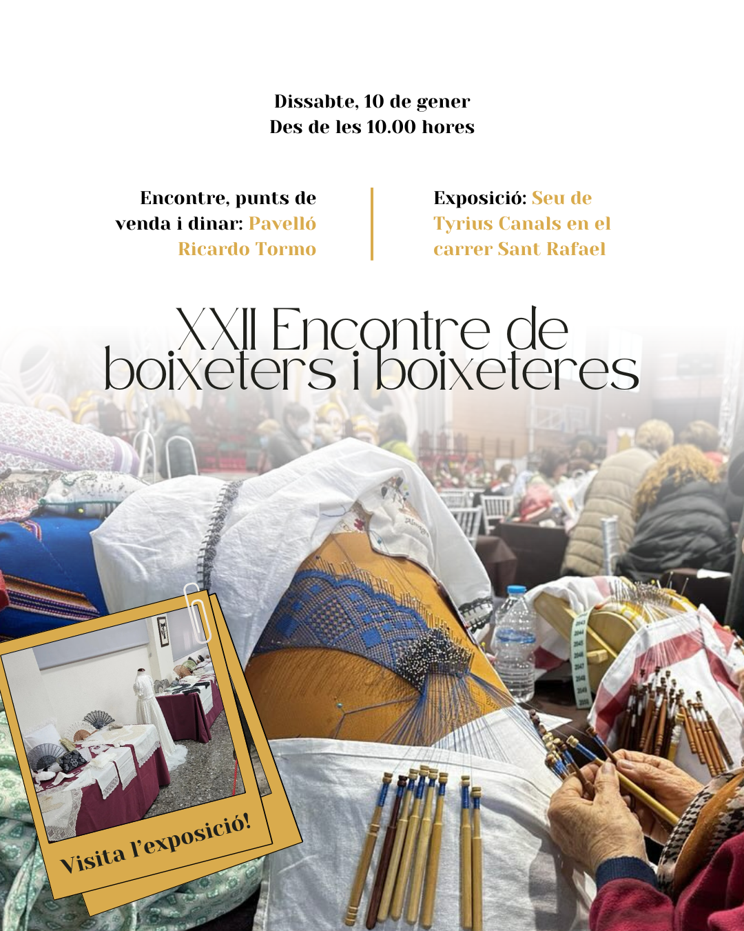 El dissabte 10 de matí tindrà lloc l’encontre de boixets al pavelló municipal Ricardo Tormo, el qual reuneix al voltant de 600 boixeters i boixeteres i prop de 18 punts de venda perquè puguen comprar tot el que necessiten. Així mateix, la seu de Tyrius Canals albergarà eixe dia l’exposició de boixets de 10:00h a 14:00h.