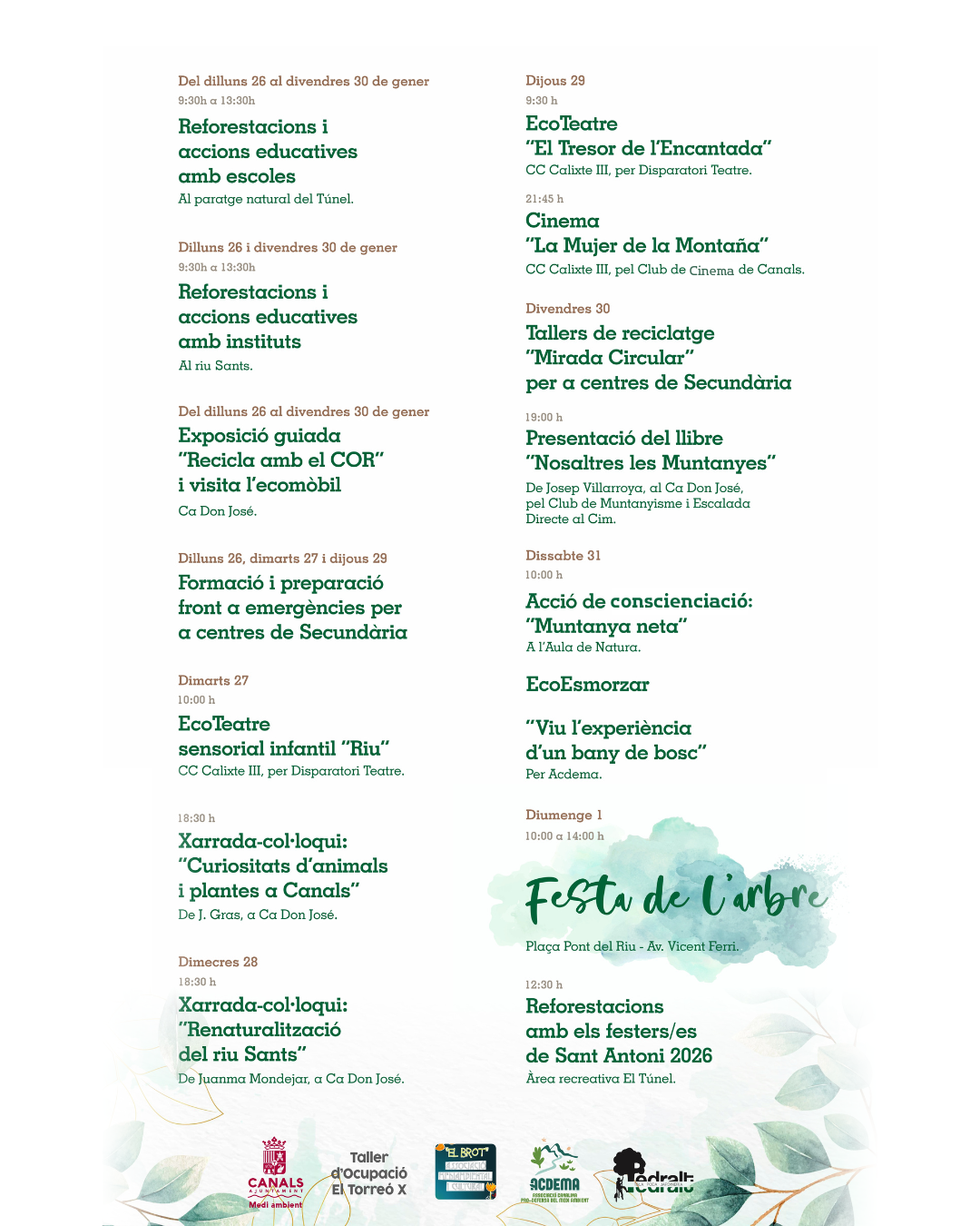 I per últim, la regidoria de Medi Ambient tanca aquesta setmana dedicada al medi ambient amb la Festa de l’Arbre que tindrà lloc aquest diumenge. Contacontes, gimcanes, mostra de productes ecològics i de proximitat es donaran cita a la plaça Pont del Riu i a l’Avinguda Vicente Ferri de 10h a 14h. A més, els Representants de la Festa de Sant Antoni del 2026 conclouran les festes amb la reforestació en el Túnel.