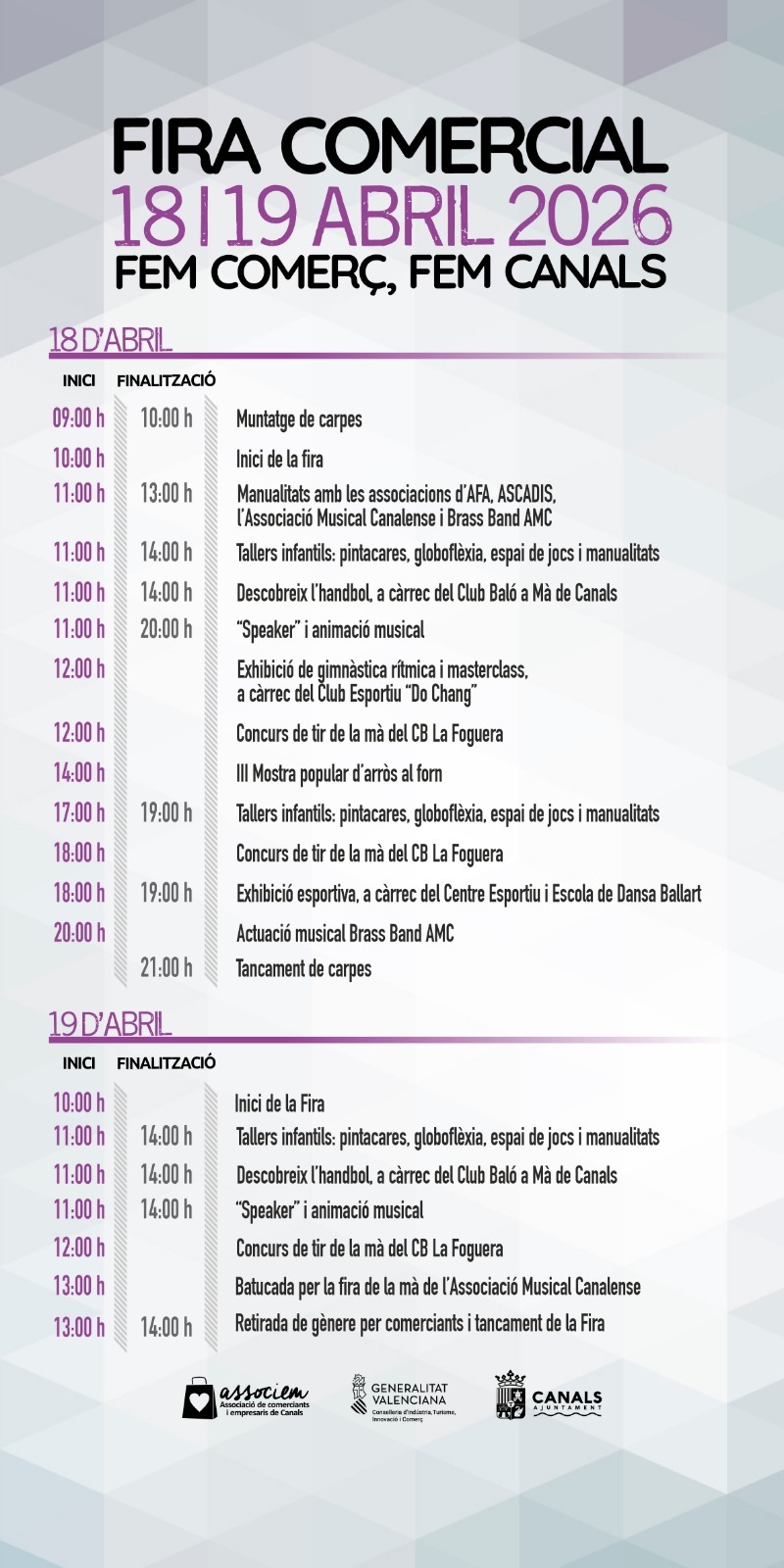 El diumenge 19 d’abril la fira començarà a les 10h. Una hora més tard, tindran lloc els tallers infantils a càrrec de Fem Escola. La fira conclourà amb una batucada de la mà de l’Associació Musical Canalense.
